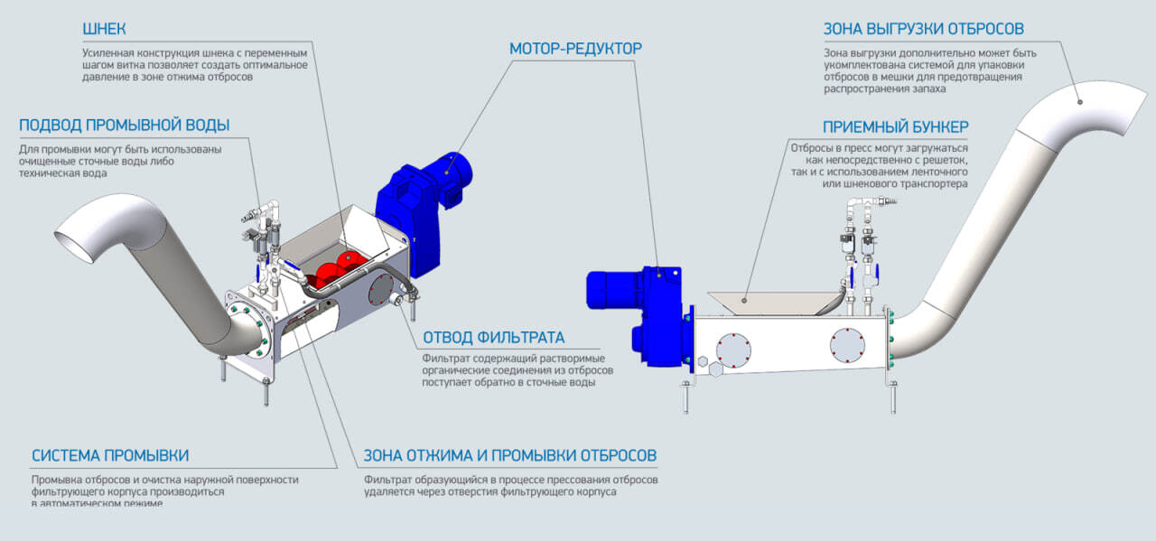 КОНСТРУКЦИЯ: пресс выполнен в виде самостоятельного оборудования, рабочим органом которого является спираль, вращающаяся в перфорированном корпусе. Отбросы через загрузочный бункер поступают в пресс и перемещаются вращающейся спиралью в зону отжима, где промываются и уплотняются, после чего подаются в трубу сброса.